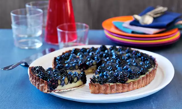 Smør blåbærmarmeladen på den ene halvdel af rektanglen, drys blåbær ovenpå og fold den anden halvdel hen over som låg. Løft i bagepapiret, så dejen er nemmere at styre og ikke knækker.