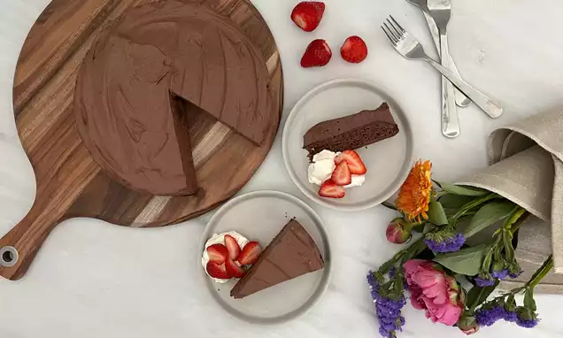 Skær kagen ud i stykker med en kniv dyppet i varmt vand, så får du fine blanke flader. Gør kniven rent imellem hvert stykke der skæres.