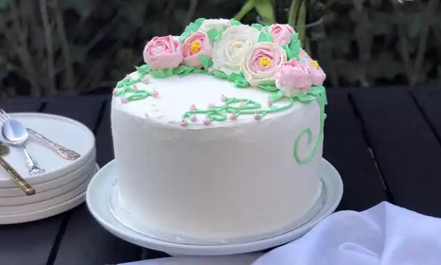 Pisk fløden til flødeskum og kom det i en sprøjtepose med stjernetyl. Sprøjt små rosetter ud på kagen. Det er bedst at vente med dette til kort inden servering.