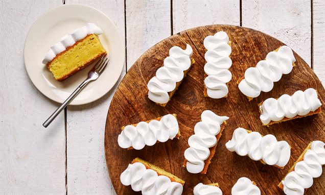 Befri den afkølede kage fra formen. Skær derefter kanterne af kagen og skær kagen i snitter på ca. 4 x 10 cm.