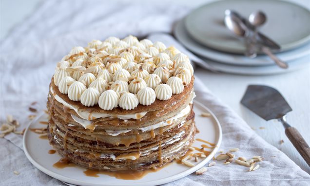Hvis du ønsker en skarp kant på kagen, så brug en kagering som udstikker på hver tilberedte pandekage. På den måde bliver alle pandekagerne lige store og du får et mere ensartet resultat, når du samler kagen.