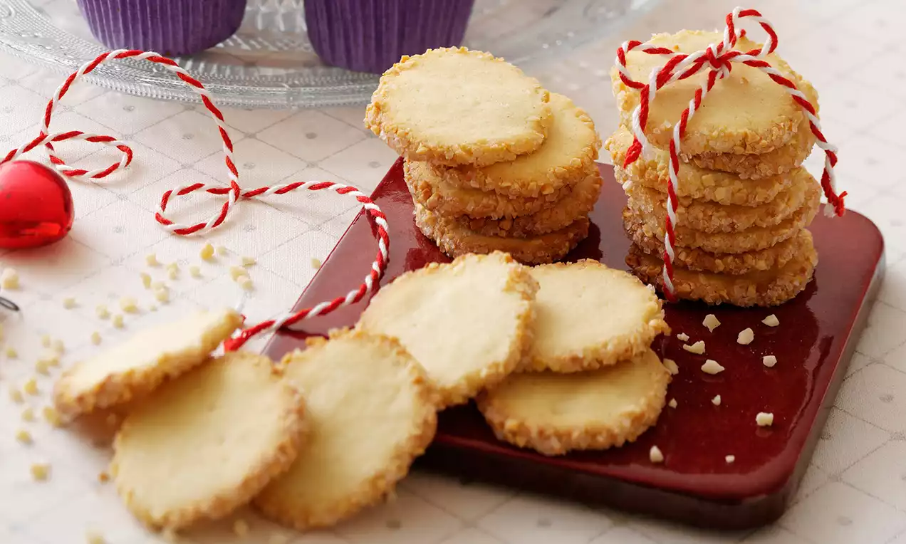 Skær rullen i skiver af 3 mm tykkelse, og læg dem på en bageplade. Bag kagerne midt i ovnen i ca. 10 minutter, til de er gyldne.