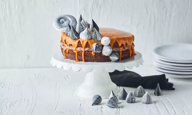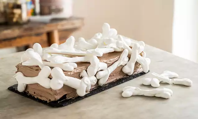 Placér en af bundene på et serveringsfad. Fordel halvdelen af moussen ovenpå. Læg herefter den næste bund på, fordel den sidste halvdel af moussen og slut af med den sidste bund. Sæt marengs-spøgelserne på toppen af kagen og øjnene på siderne i moussen.