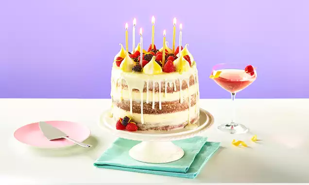 Beklæd bunden af en springform (ø 20 cm) med bagepapir og smør den. Hæld dejen i. Bag kagen midten i ovnen i 30-35 minutter. Mærk efter med et træspyd om den er nok bagt. Der må ikke sidde dej på spyddet. Hvis kagen får for meget farve i ovnen, kan der kommes et stykke stanniol over mens den bager færdig.