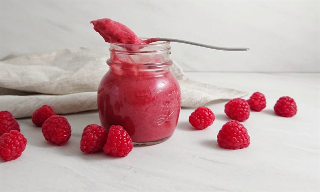 Hindbærcurden kan fryses. Lad den tø op i køleskabet natten over og rør den igennem inden brug.