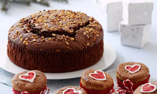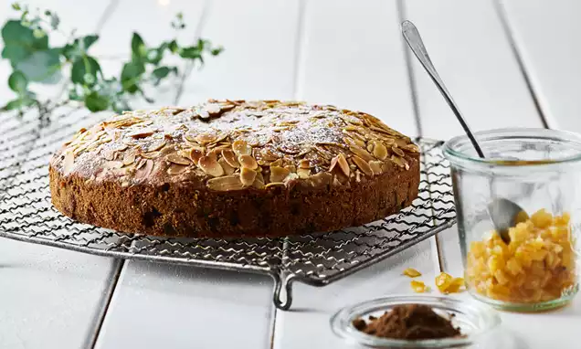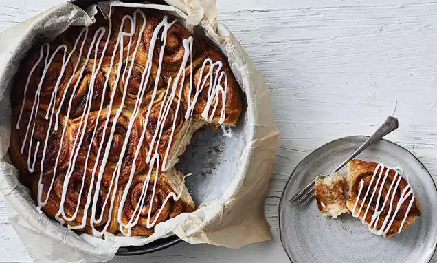 Bag kanelkagen midt i ovnen i 25-30 minutter. Mærk efter med et træspyd om kagen er færdigbagt. Der må ikke sidde dej på spyddet. Lad kagen køle af i formen.