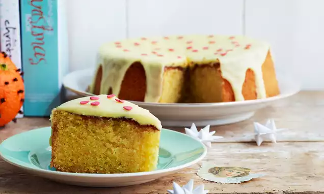 Fordel glasuren i et jævnt lag på den afkølede kage og drys med krymmel.
