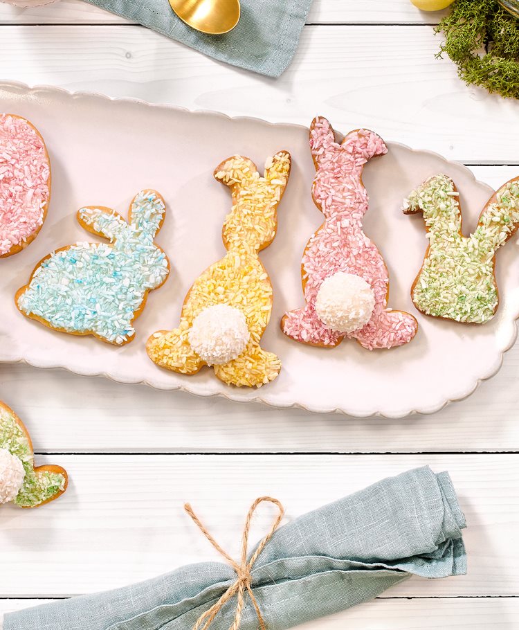 Fordel glasuren på kanin småkagerne og drys farvet kokosmel henover.