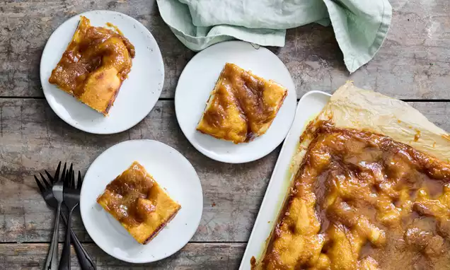 Rul dejen ud på et let meldrysset bord til en rektangel på ca. 32x45 cm. Fordel remoncen ud over dejen, helt ud til kanten. Fold ⅓ af dejen ind over midten. Gentag med den anden side, så der bliver tre lag dej. Rul dejen let med en kagerulle, så den måler ca. 32x20 cm.