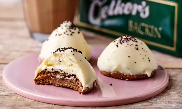 Kom den tilberedte Cake Mousse i en sprøjtepose. Stænk evt. makronerne med et par dråber cognac eller appelsinlikør. Sprøjt moussen på makronerne, og sæt dem i fryseren i ca. en time, indtil cremens overflade er iskold/frossen.