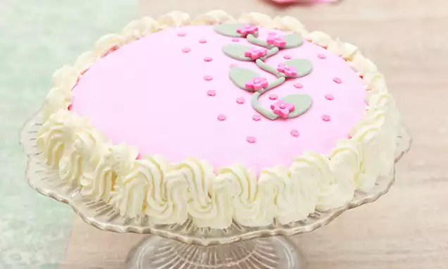 Rul Hvid Fondant tyndt ud på et bord drysset med flormelis. Udskær et låg der passer til toppen af rouladekagen. Farv resten af fondanten med Concentrated Blue Colour og tril den til en lang pølse. Rul den flad og skær den til, så det kan bruges som et bånd rundt om kagen.