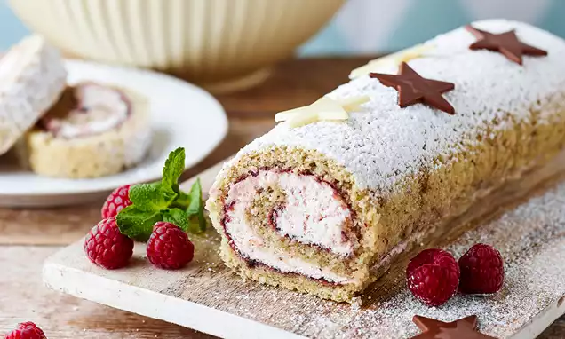 Vend den bagte rouladebund ud på et stykke sukkerdrysset bagepapir og læg et fugtigt viskestykke over, hvilket gør dejen nemmere at rulle sammen. Lad bunden køle lidt ned, men den skal stadig være lidt lun ved rulning, for så undgås det nemmere at bunden sprækker.