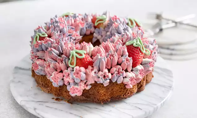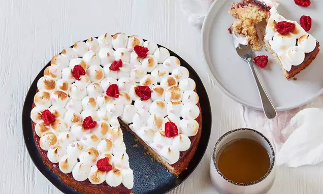 Top kagen med skummet, brug en dejskraber eller en paletkniv til at smøre skummet udover kagen. Flamber kagen med en gasbrænder eller kom kagen i ovnen i 3-5 minutter indtil toppen er gylden.