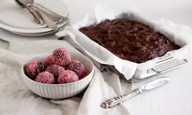 Bag kagen midt i ovnen i 40-45 minutter. Mærk efter med et træspyd om kagen er færdigbagt. Der må ikke sidde dej på spyddet. Lad kagen køle lidt af i formen, hvorefter den vendes ud og køles helt af på en bagerist.
