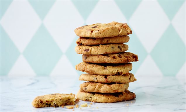 Læg bagepapir på en bageplade. Lav cookies af kagedejen ved at lægge klatter af ca. 2 spsk dej på bagepladen. Tryk klatterne let flade med en gaffel og bag småkagerne i midten af ovnen i 10-15 min. alt efter om du ønsker en blød eller sprød midte. Cookien skal være let lysebrun i bunden når du vender den om.