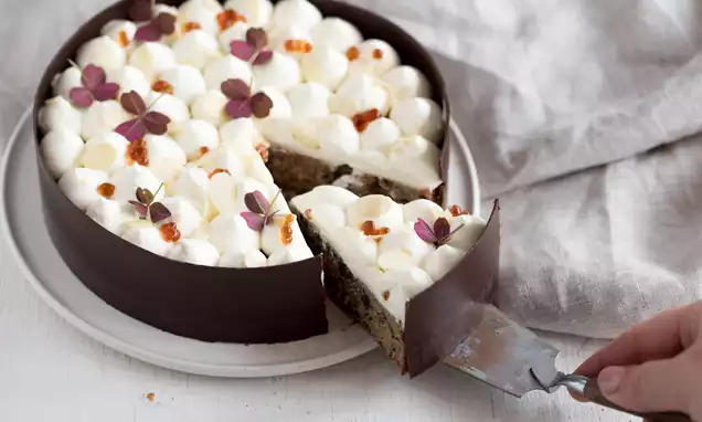 Placér den frosne kage på en rist med et fad under og hæld den hvide glaze udover. Flyt forsigtigt kagen over på et kagefad, og lad den tø op i køleskabet.
