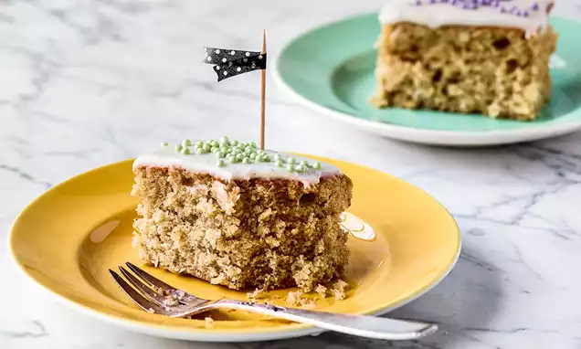 Hæld dejen i en smurt bradepande (20 x 30 cm) og bag kagen 30-35 minutter. Lad kagen afkøle helt på en bagerist, inden den pyntes.