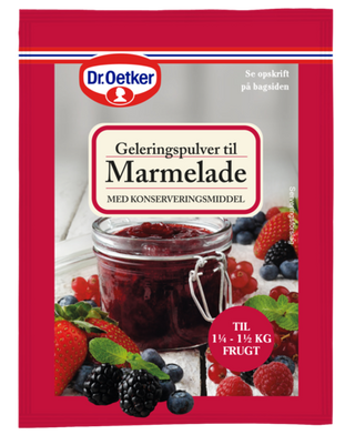 Hjemmelavet smager bare bedst, og med Dr. Oetkers geleringsprodukter er du sikret et godt resultat! Lav din egen marmelade med præcis den sødme, som du gerne vil have. Du kan også fremtrylle en lækker frugtgrød eller gelé med vores geleringsprodukter. På bagsiden af alle emballager finder du en nem opskrift og fremgangsmåde til marmelade, gelé og grød.